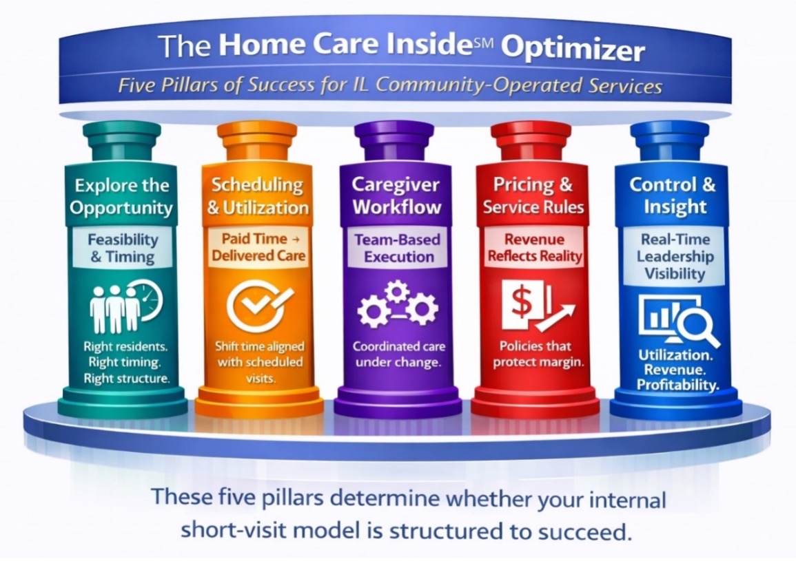 The Home Care Inside℠ Optimizer is an executive-level diagnostic framework designed specifically for Independent Living communities providing short-visit services to their residents.