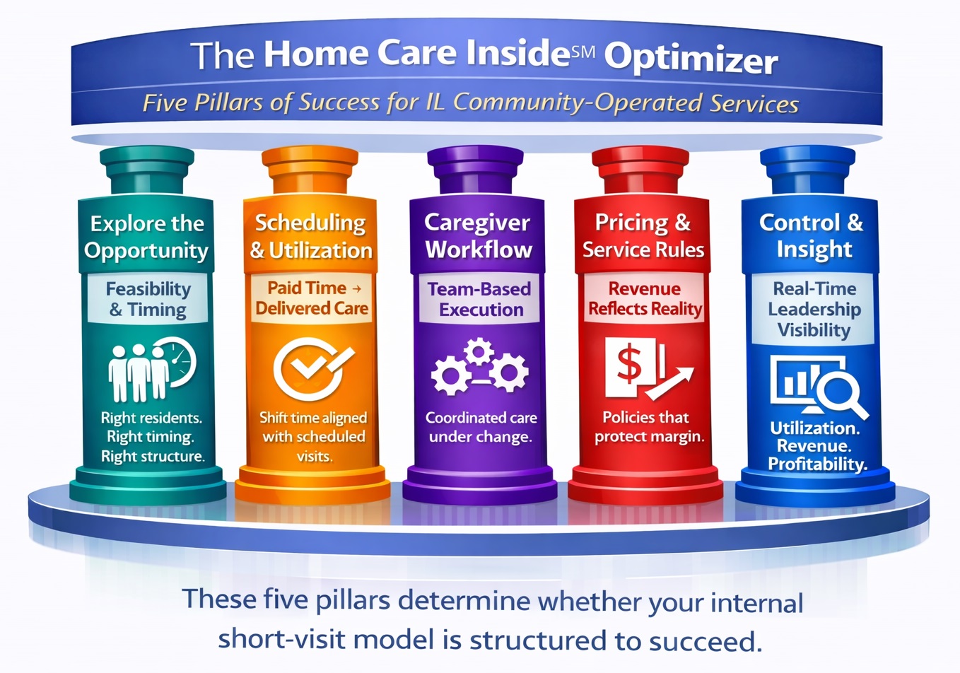 The Home Care Inside℠ Optimizer is an executive-level diagnostic and operating framework designed specifically for those delivering short-visit services inside Independent Living communities.